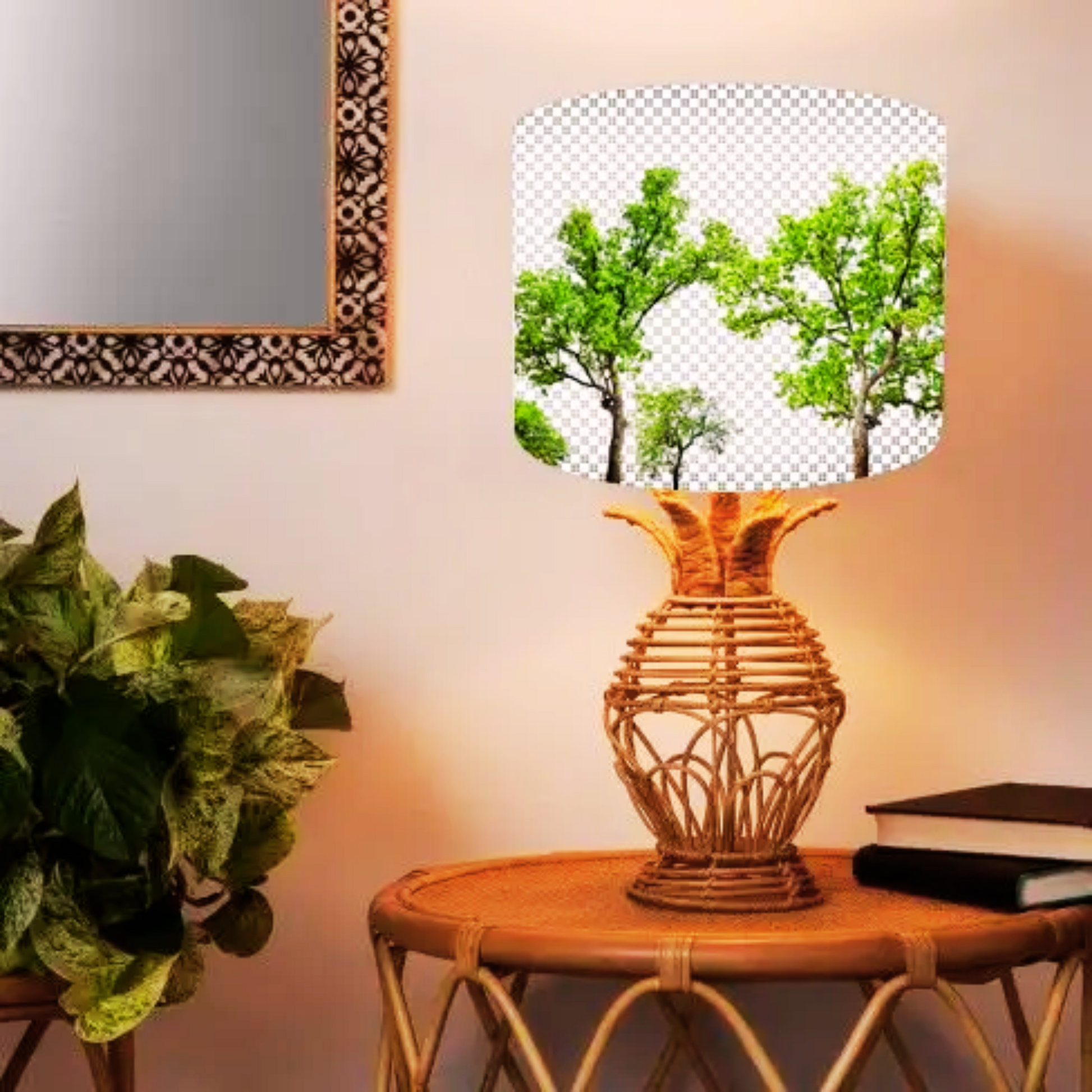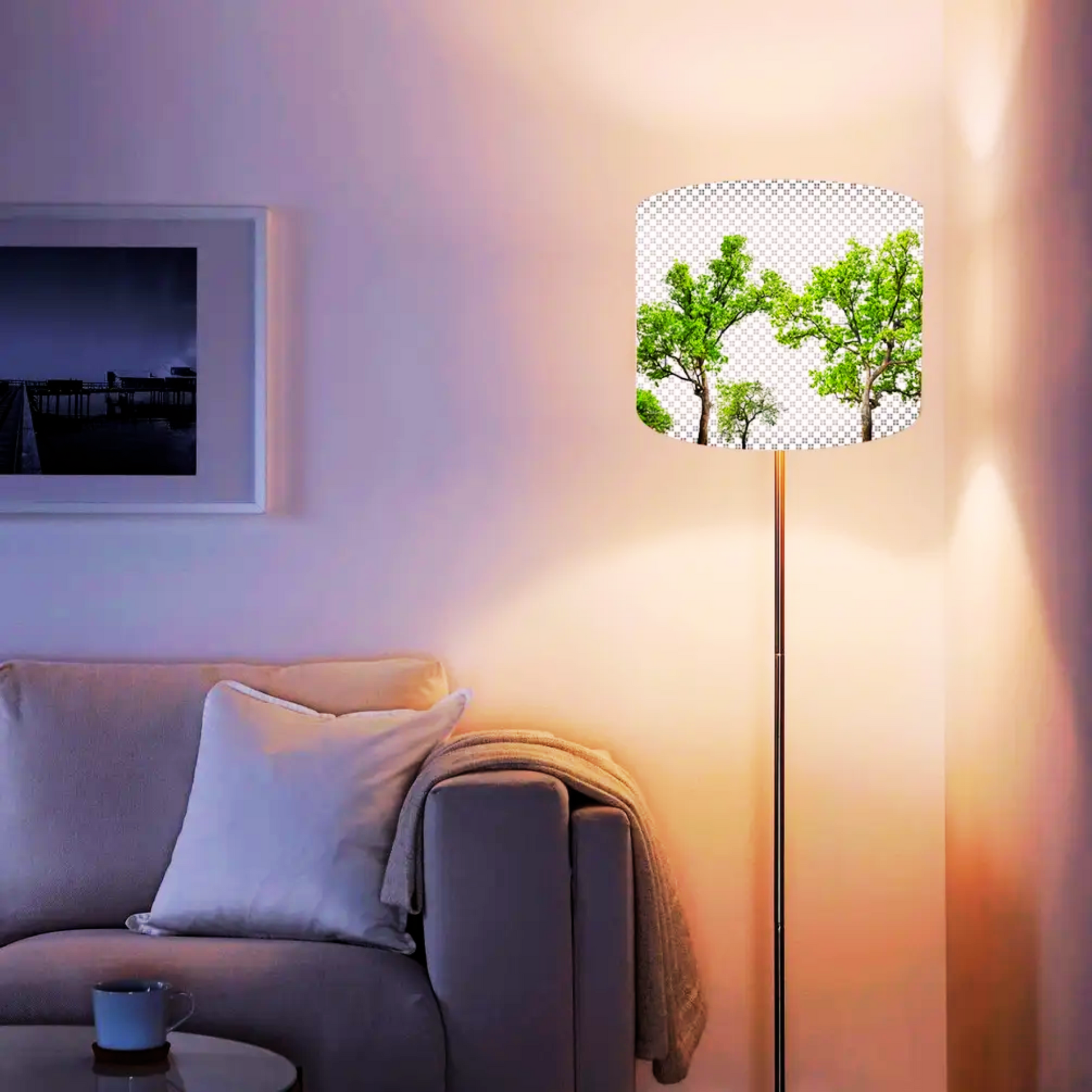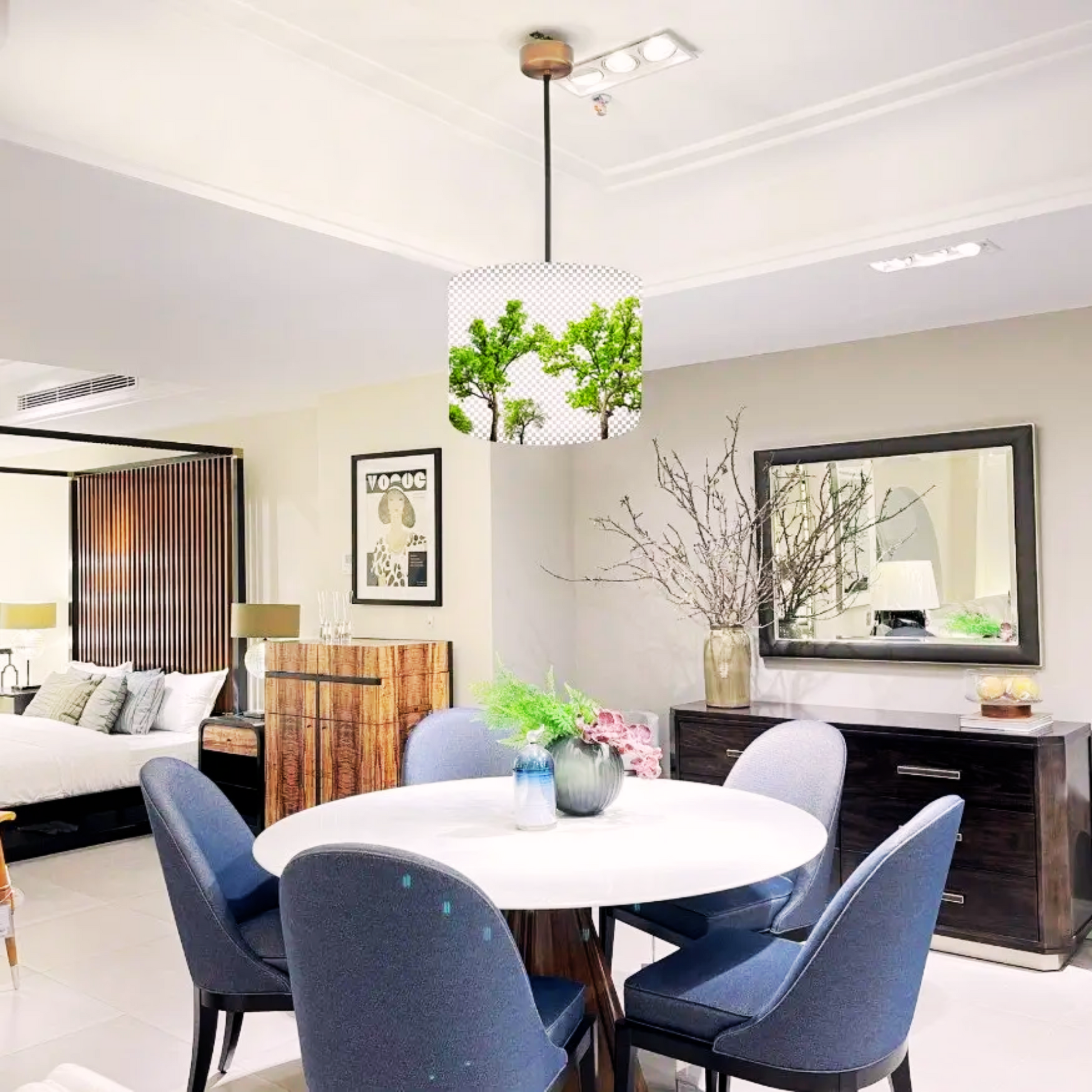 - Design: Exclusive lampshade design by H-H, 100% hand made product. Minimalist design, with printed images of green trees on a fancy black and white checkered fabric background. Fabric material helps diffuse light well and makes your space more lively and magical.