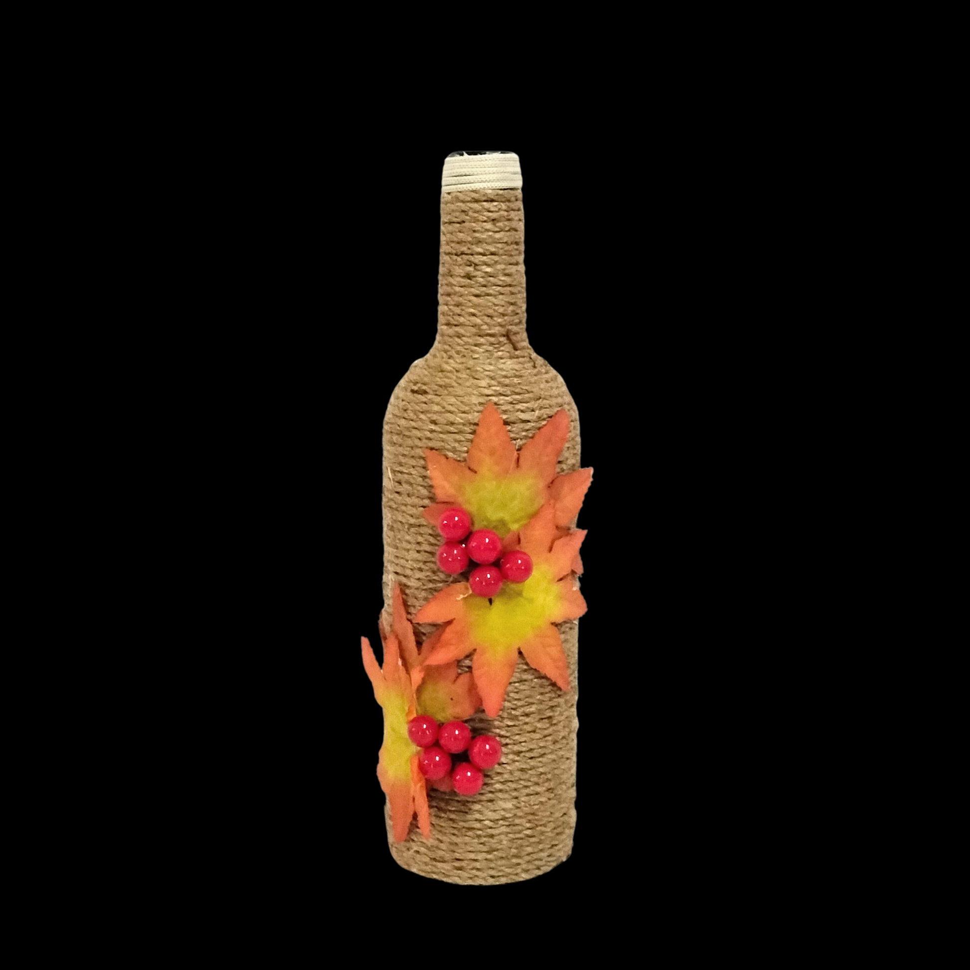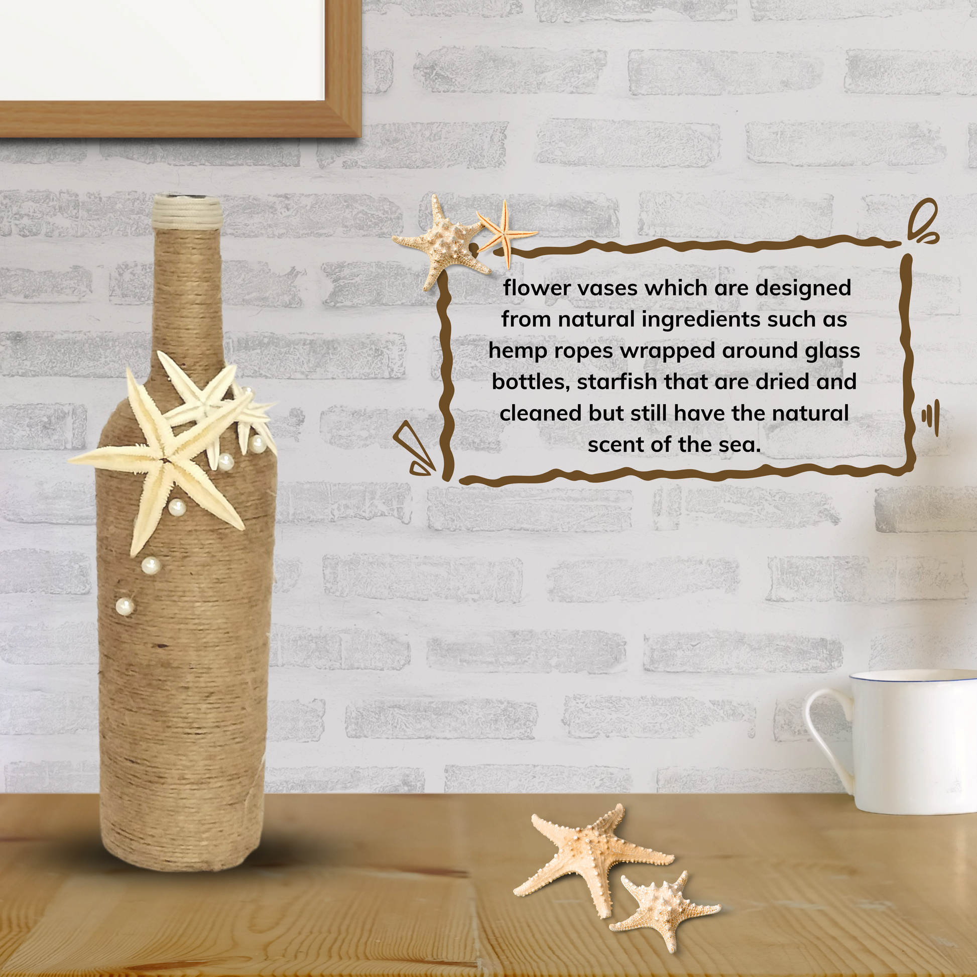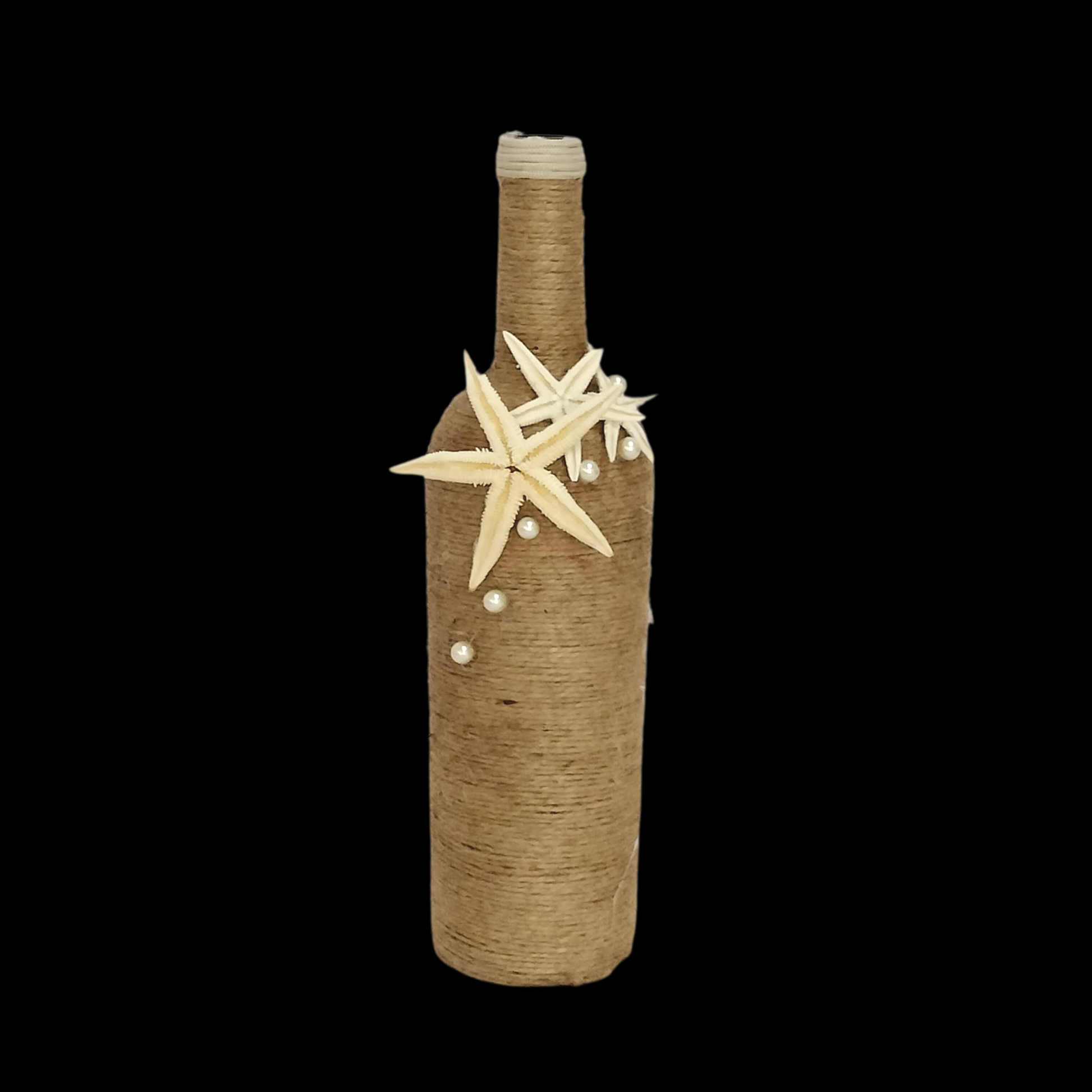 Glass bottles have elegant designs, covered with ropes, decorated with flowers, leaves, sea shell.