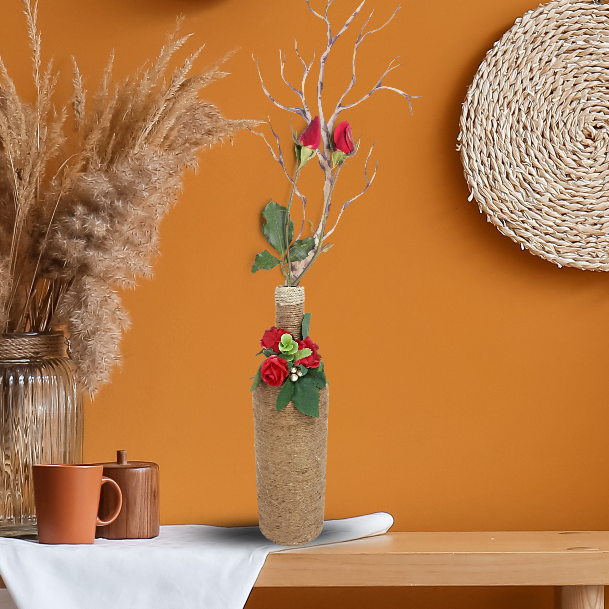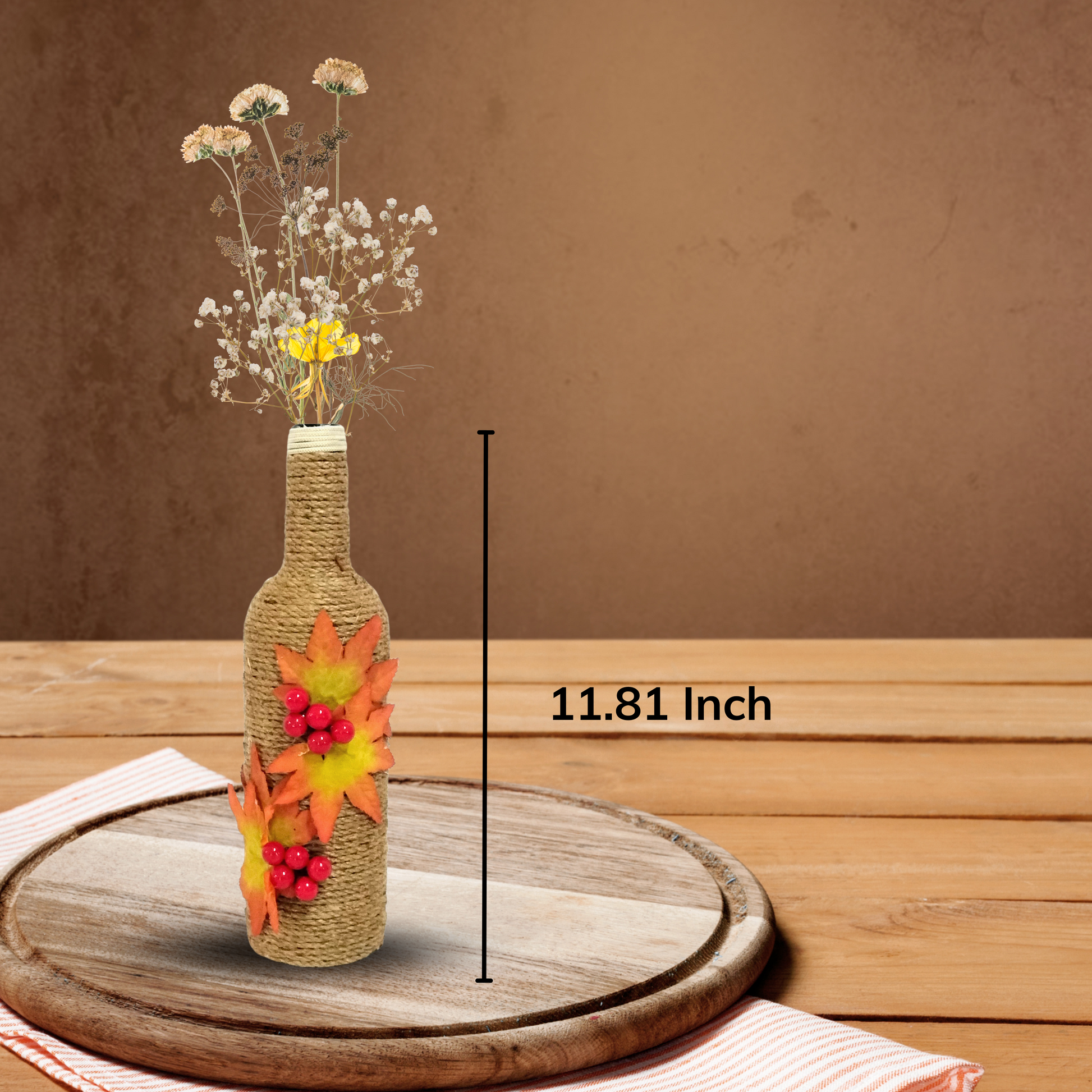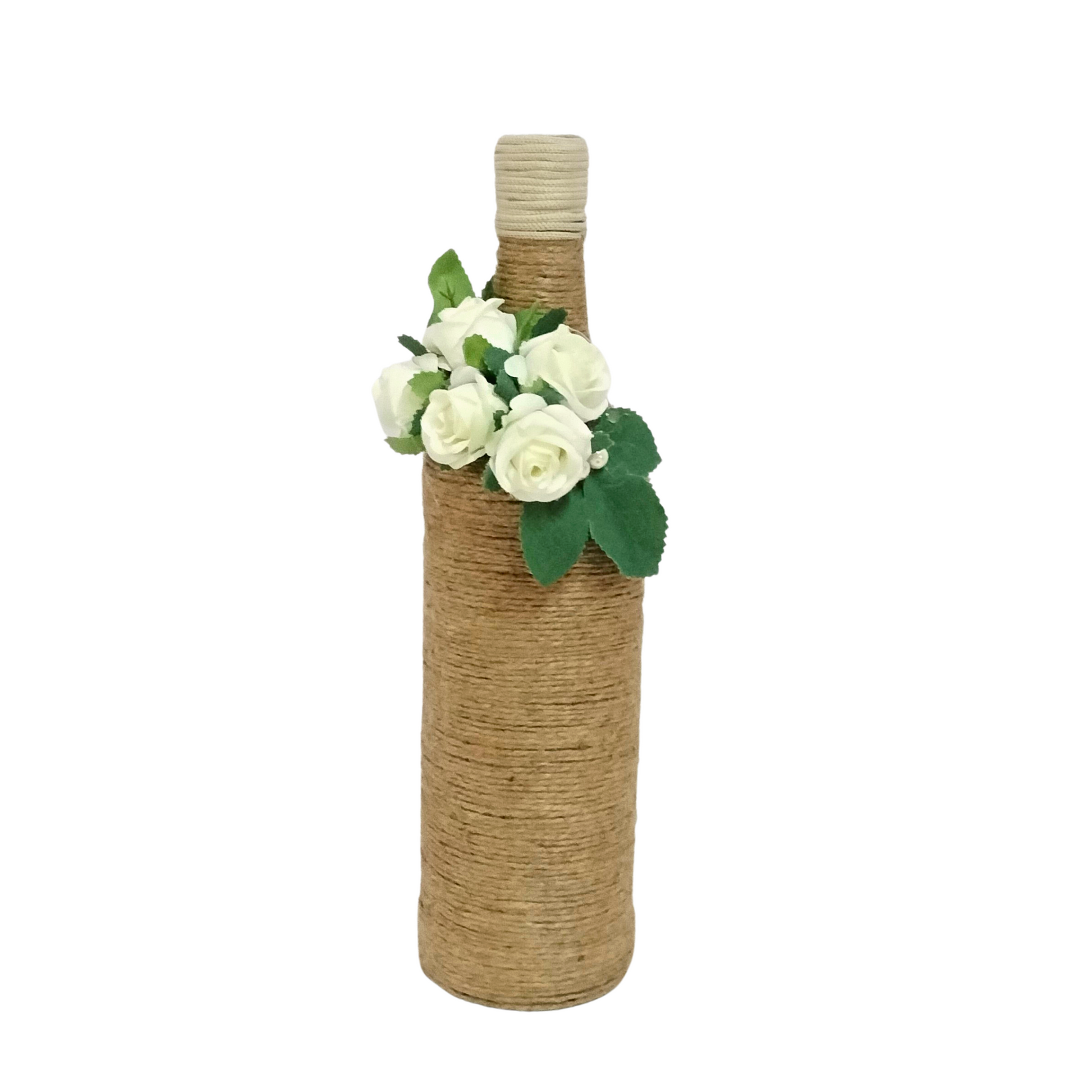 Glass bottles have elegant designs, covered with ropes, decorated with flowers, leaves, sea shell.