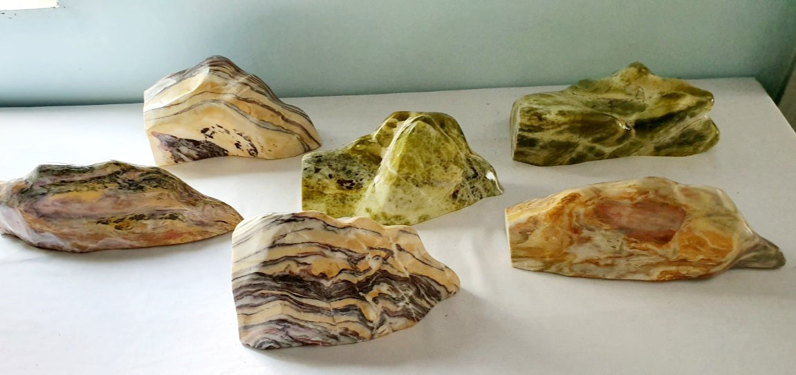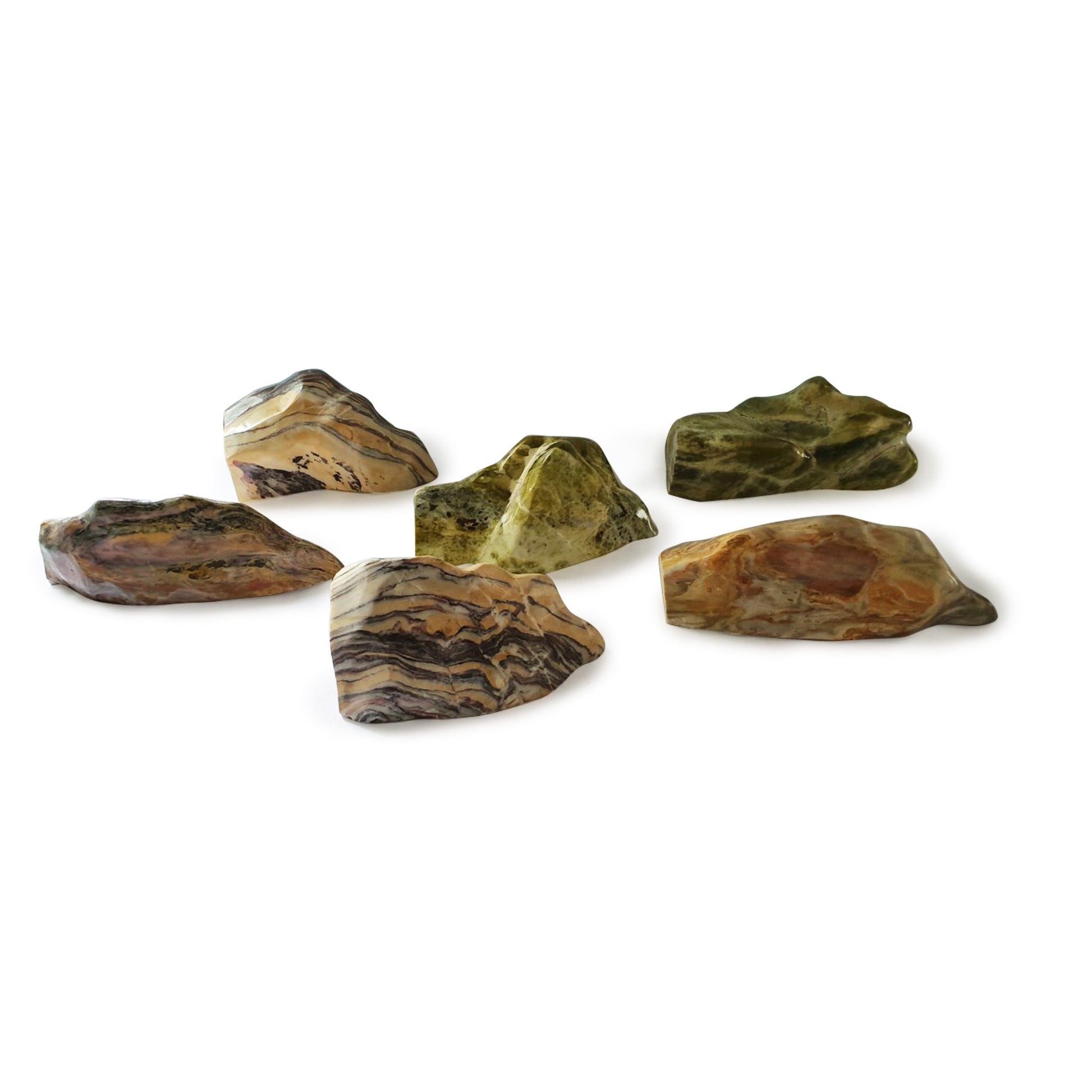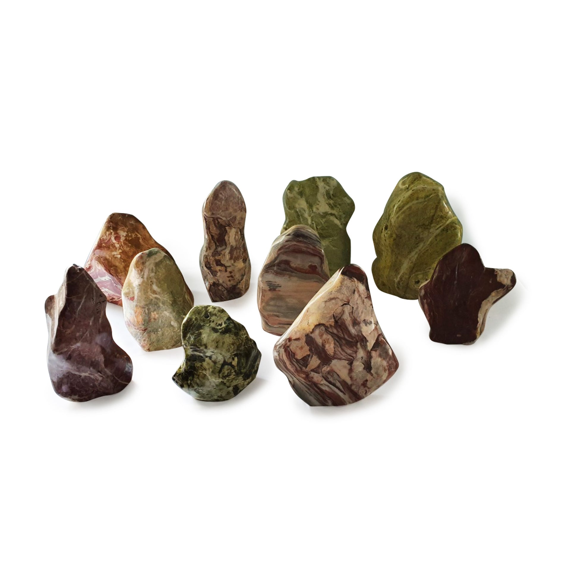Placed in a garden, these marblle stone shaped iridescent stones create a striking pop of soothing color among your outdoor elements. Each design varies in shape and size due to its handmade nature making each piece one-of-a-kind. What makes these decorative pieces so unique is the color process that includes iridescent finishes used to brighten the stones. These beautiful stones are for decorating gardens and pathways as an alternative to sea glass..