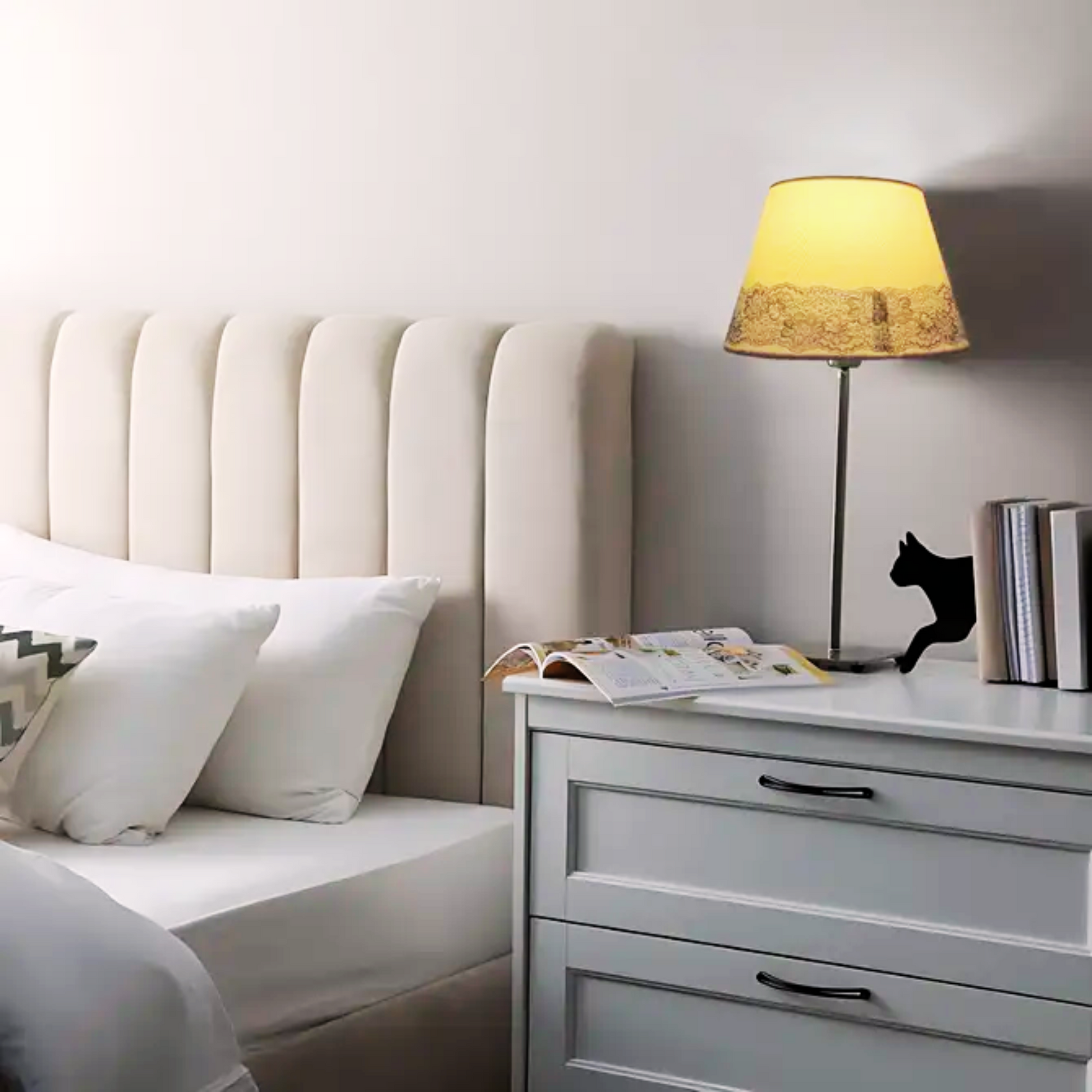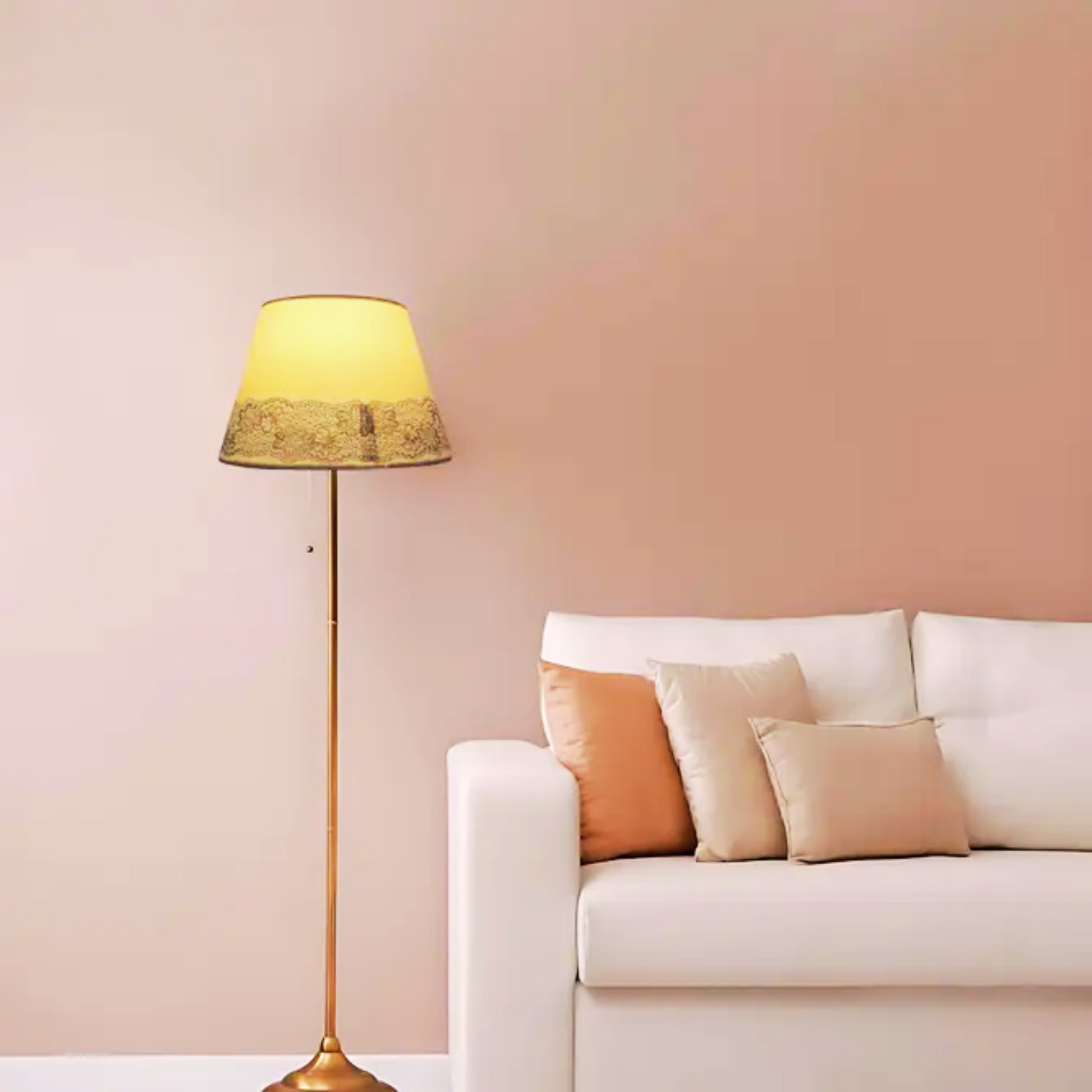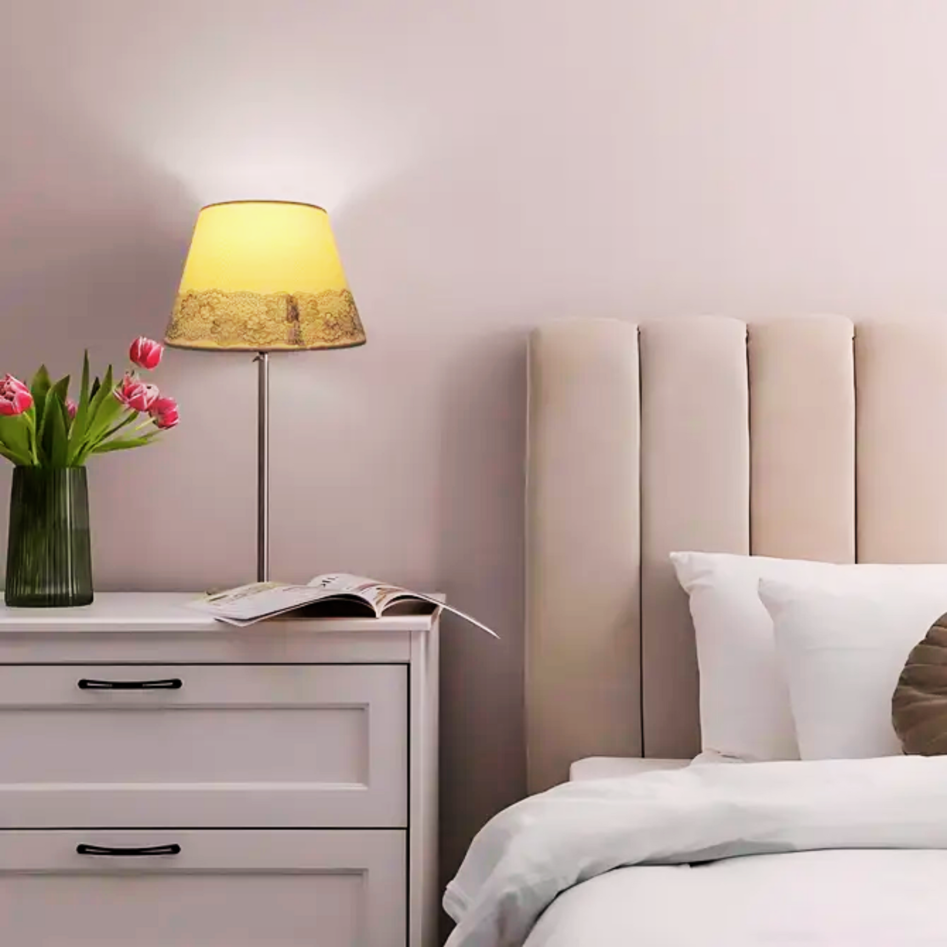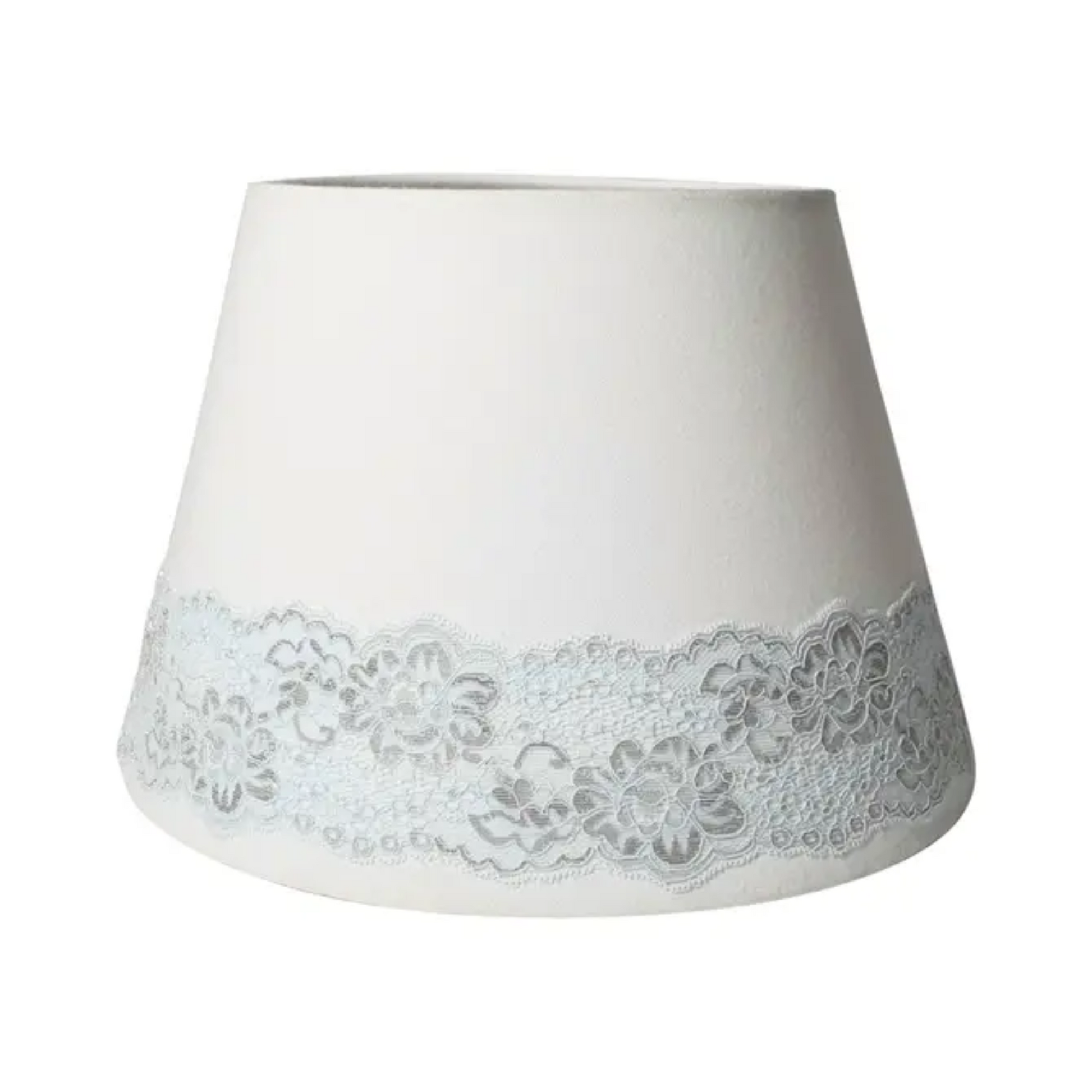 The lampshade is made of silk fabric wuth gray lace decoration , which looks very luxurious.