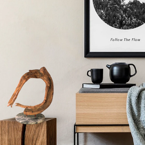 The Wood's Legacy: The core sculpture is crafted from Ancient Driftwood, wood that has rested and been naturally preserved beneath the earth for an estimated hundreds of years. This process lends the wood an extraordinary hardness, a smooth yet complex surface texture, and a rich, warm, reddish-brown hue. The stunning loop shape is a rare natural occurrence, meticulously highlighted by the artisan.