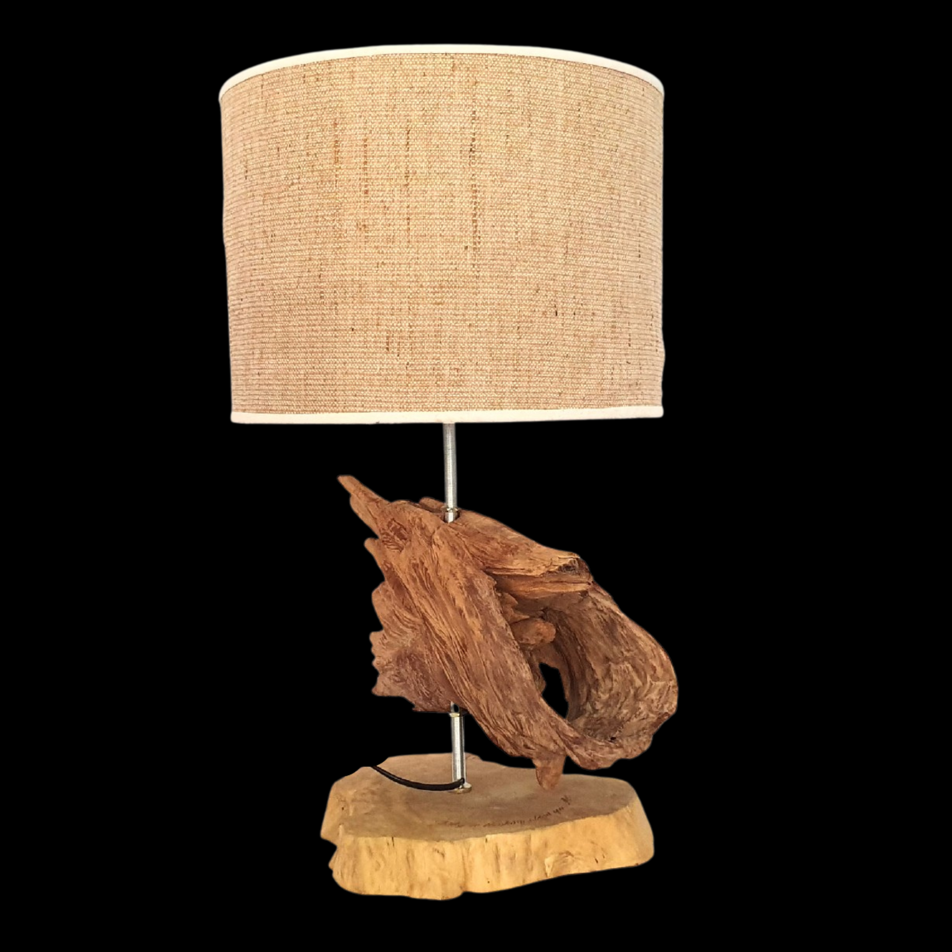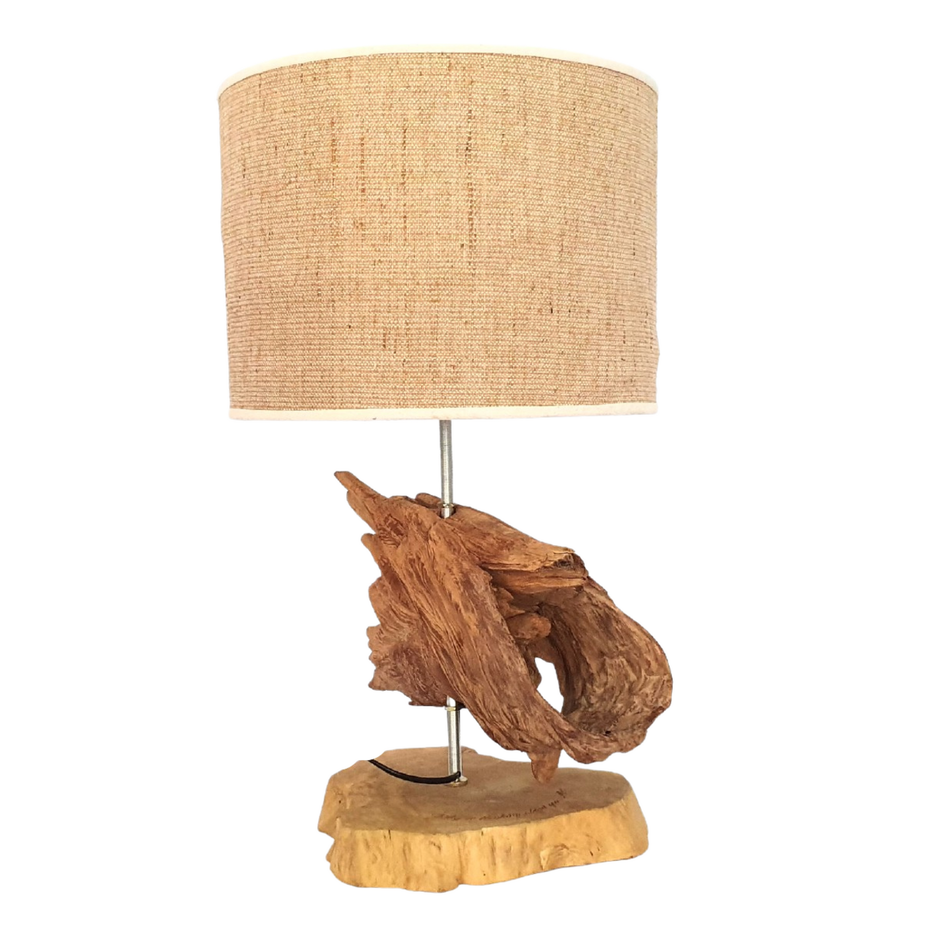 The body of the lamp is made from driftwood, which is collected from the shores of the ocean and carefully cleaned and polished.