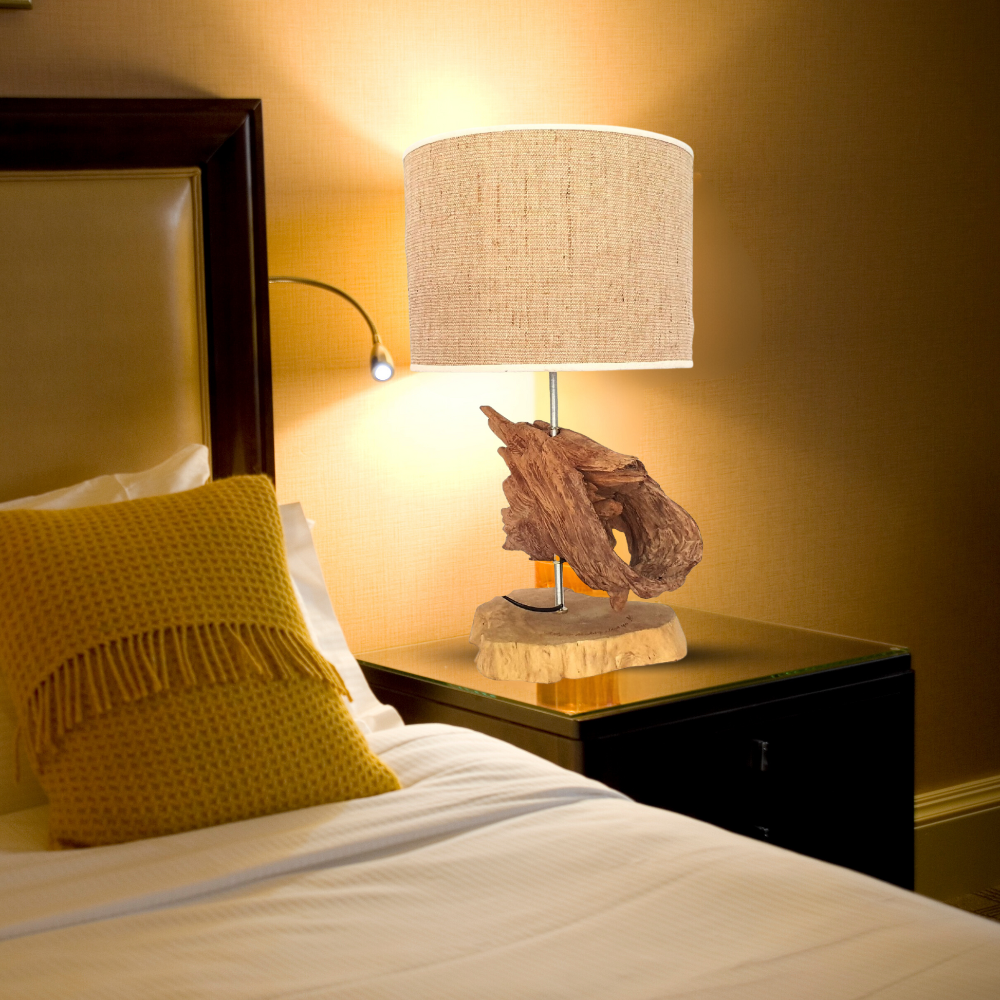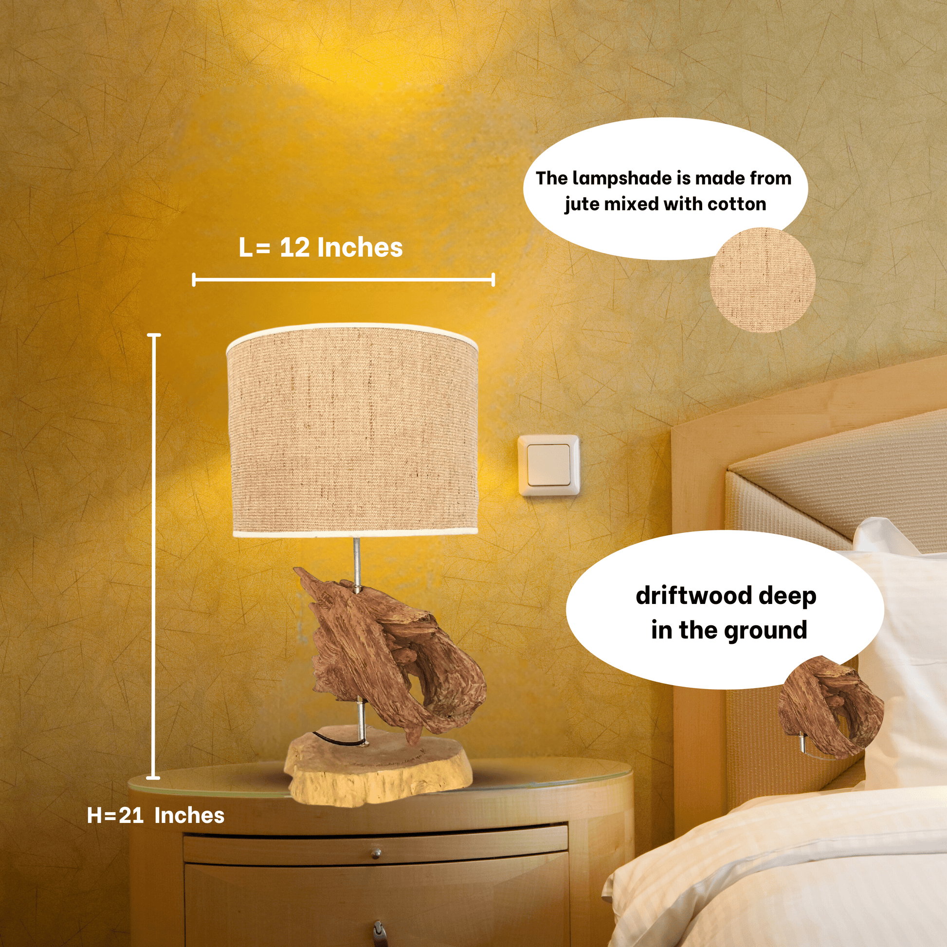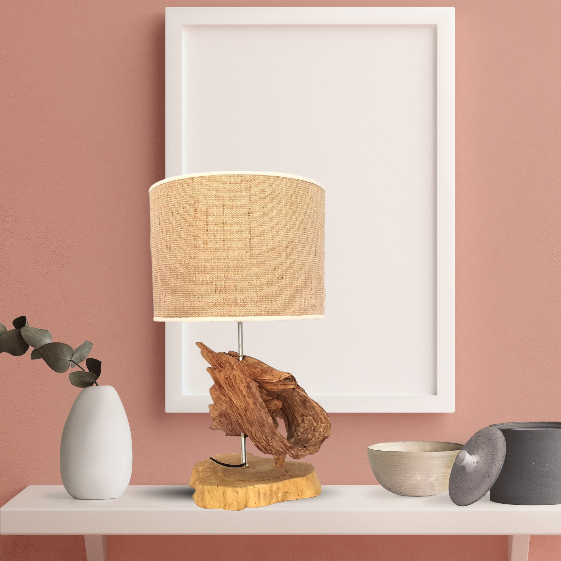 The lampshade has a cylindrical shape and a beige color that matches well with the driftwood.