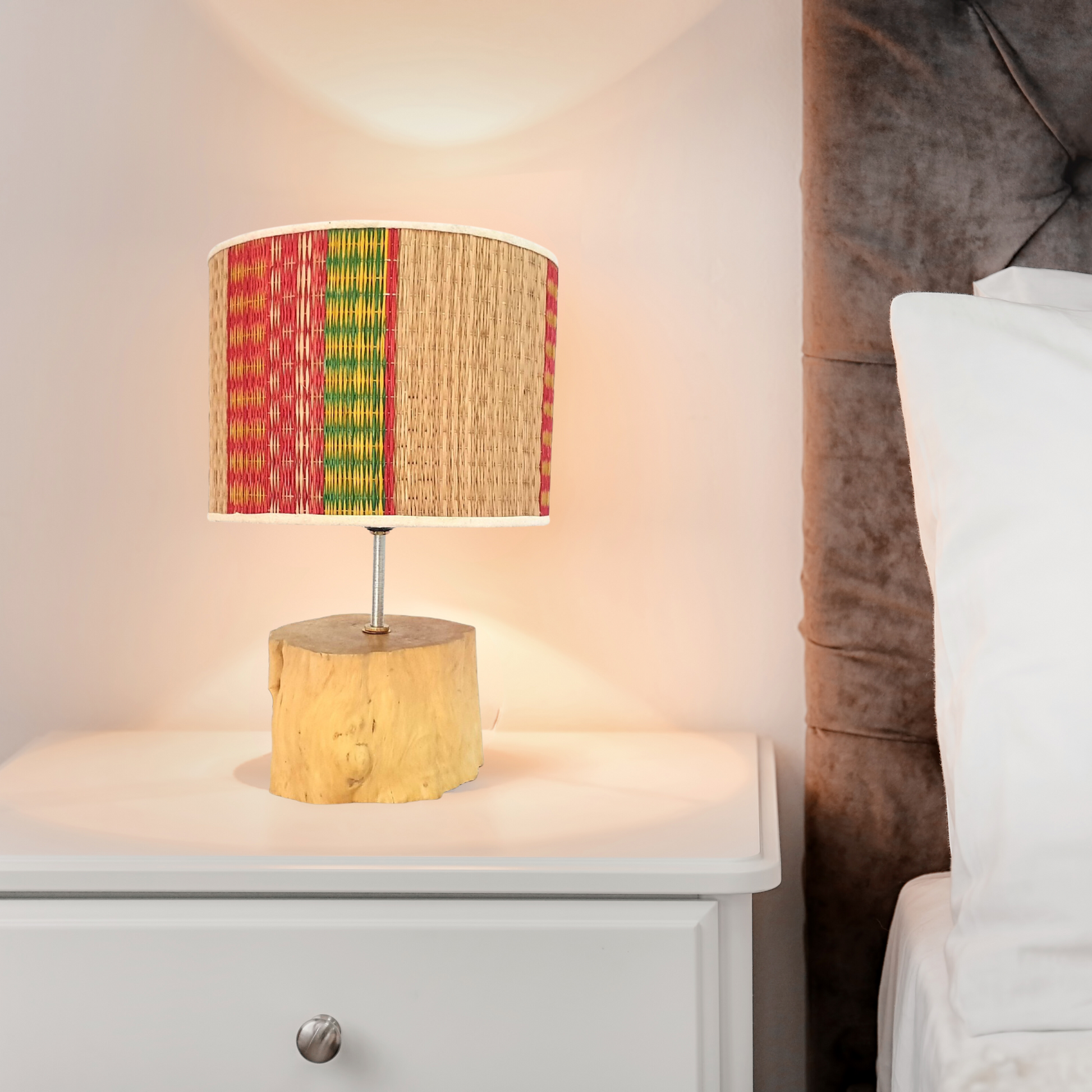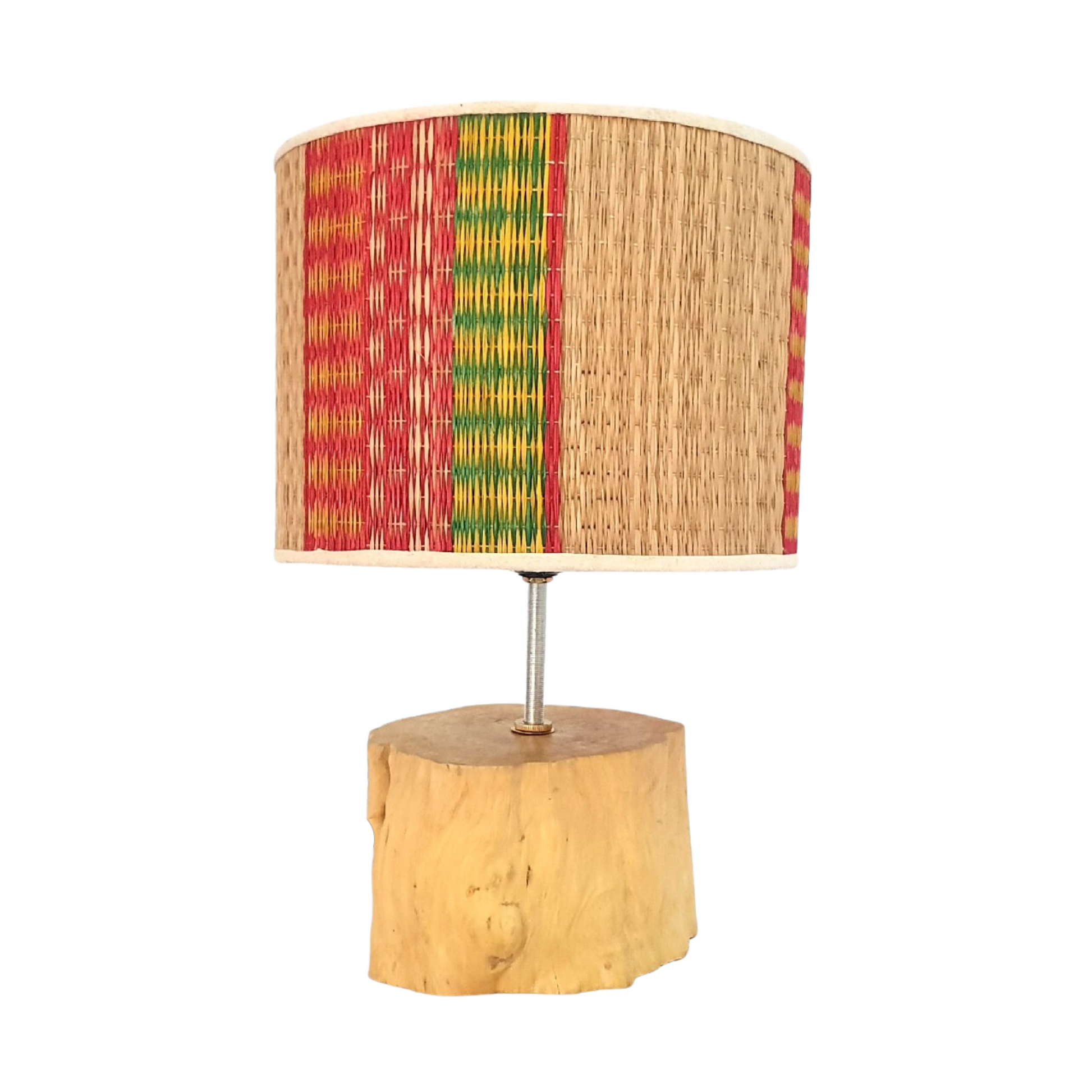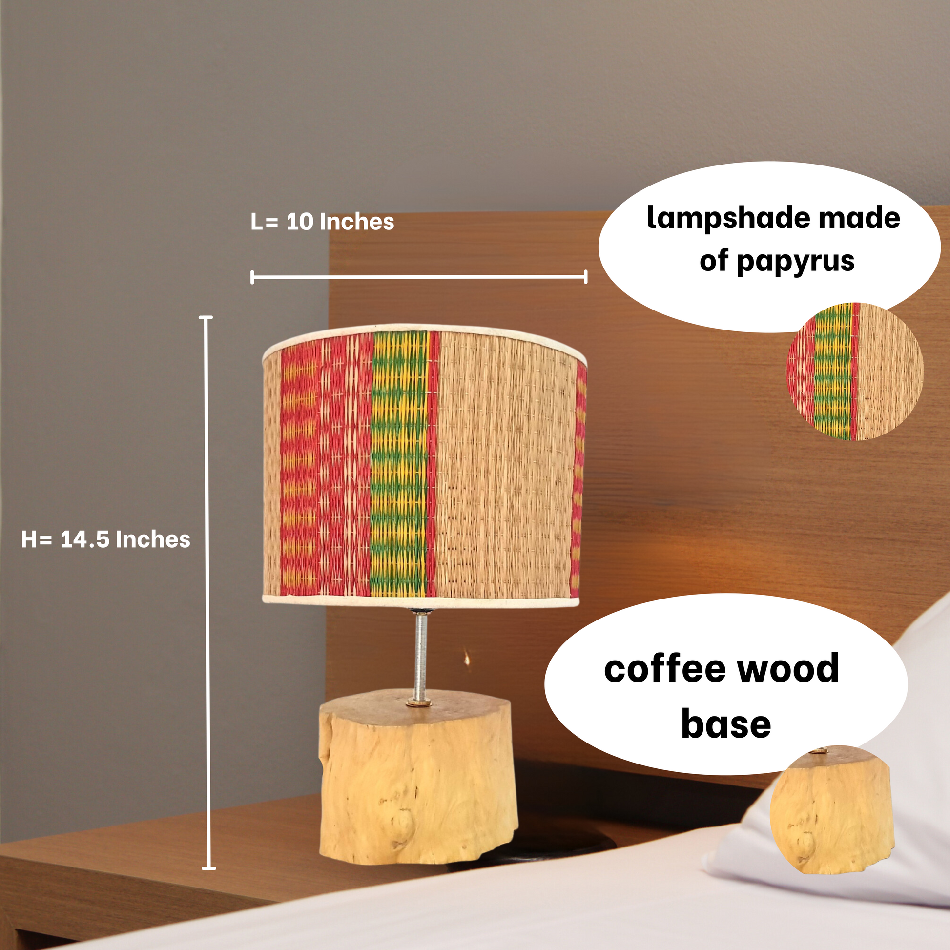 🍀 What's included: 01 wood holder equipped with 01 light bulbs.This table lamp has a body made of coffee wood. Lampshades are made of colorful sedge mats made by craftsmen, this is also a traditional feature of Vietnam. Its warm light and unique shape create a cozy and friendly atmosphere in any room, making it perfect for reading, studying or simply relaxing.