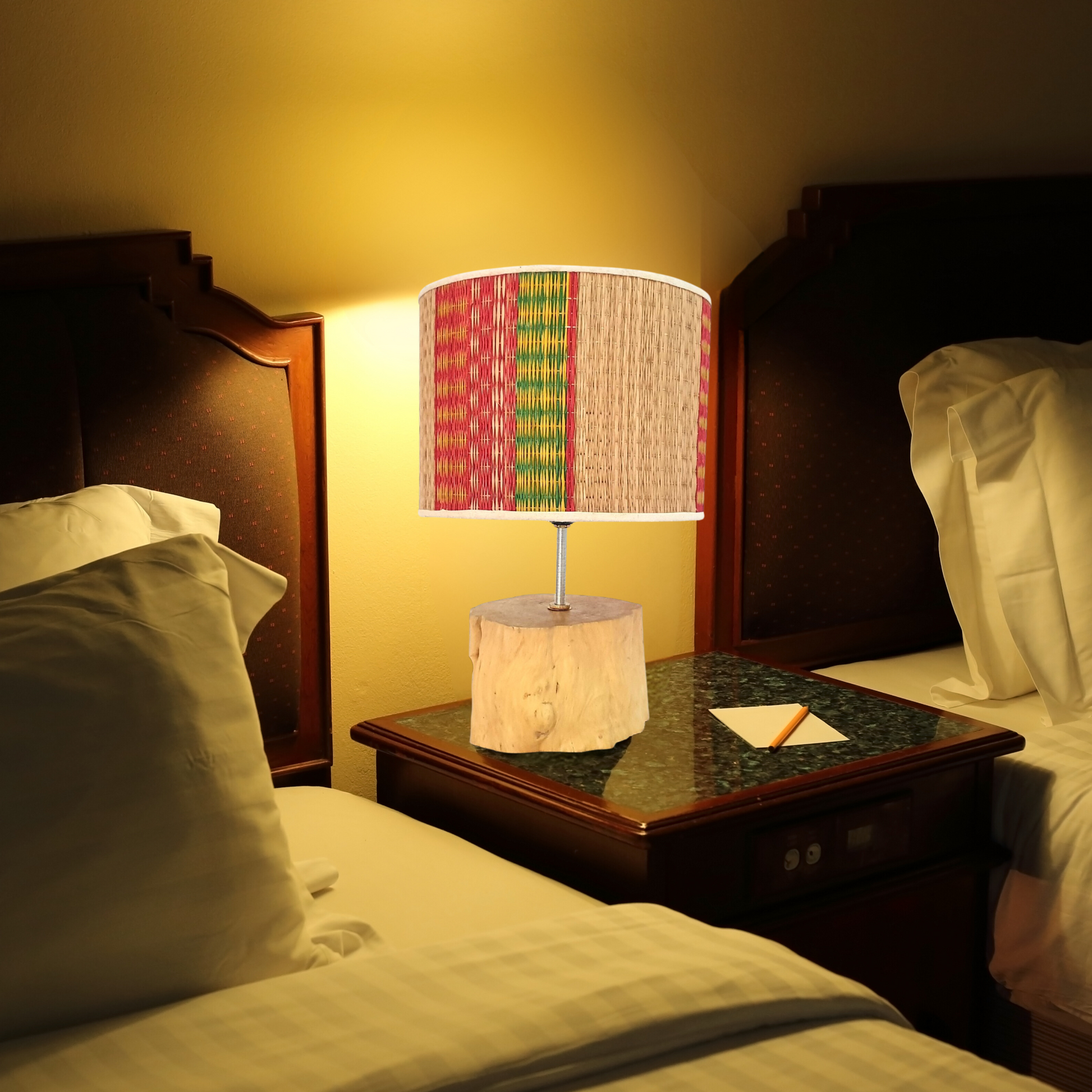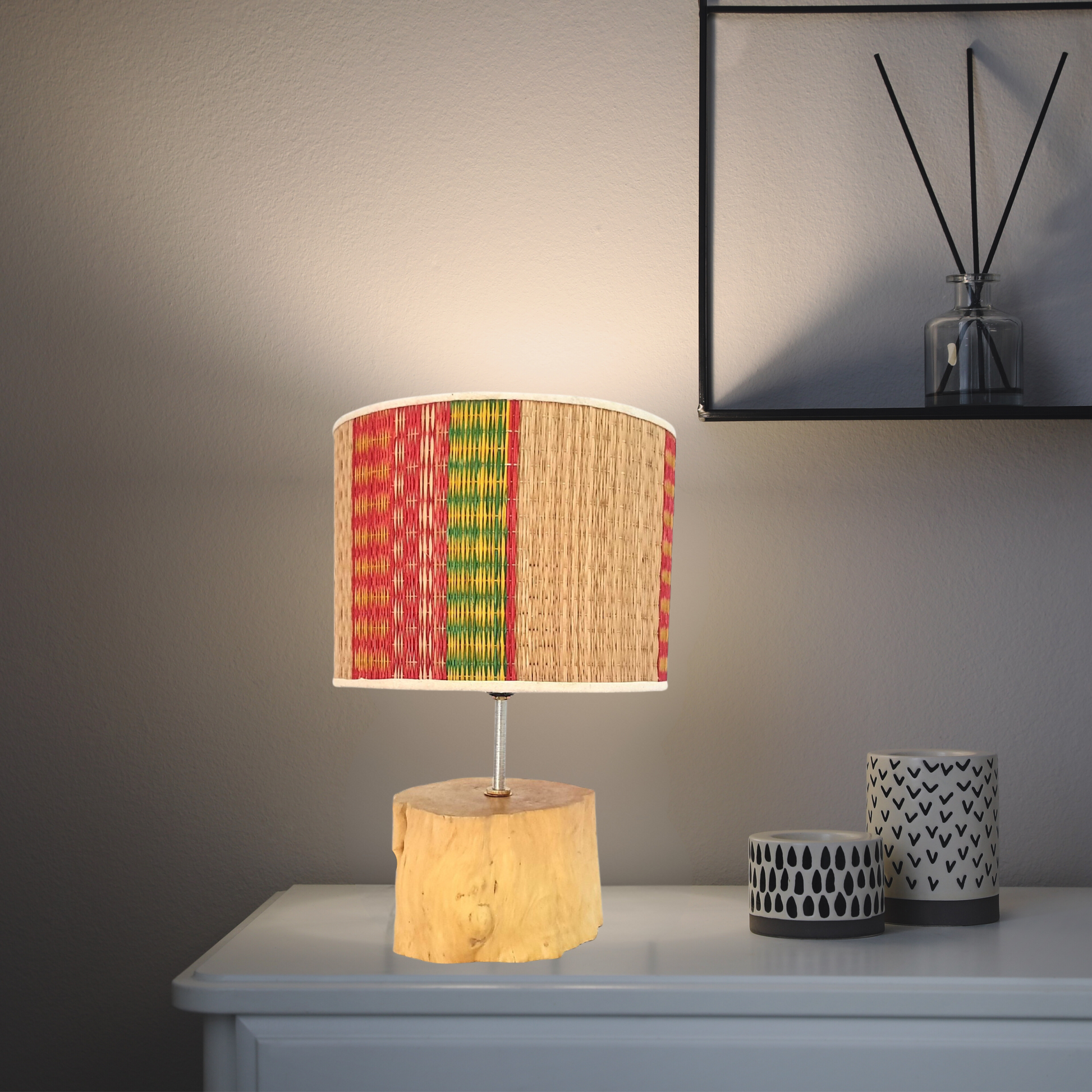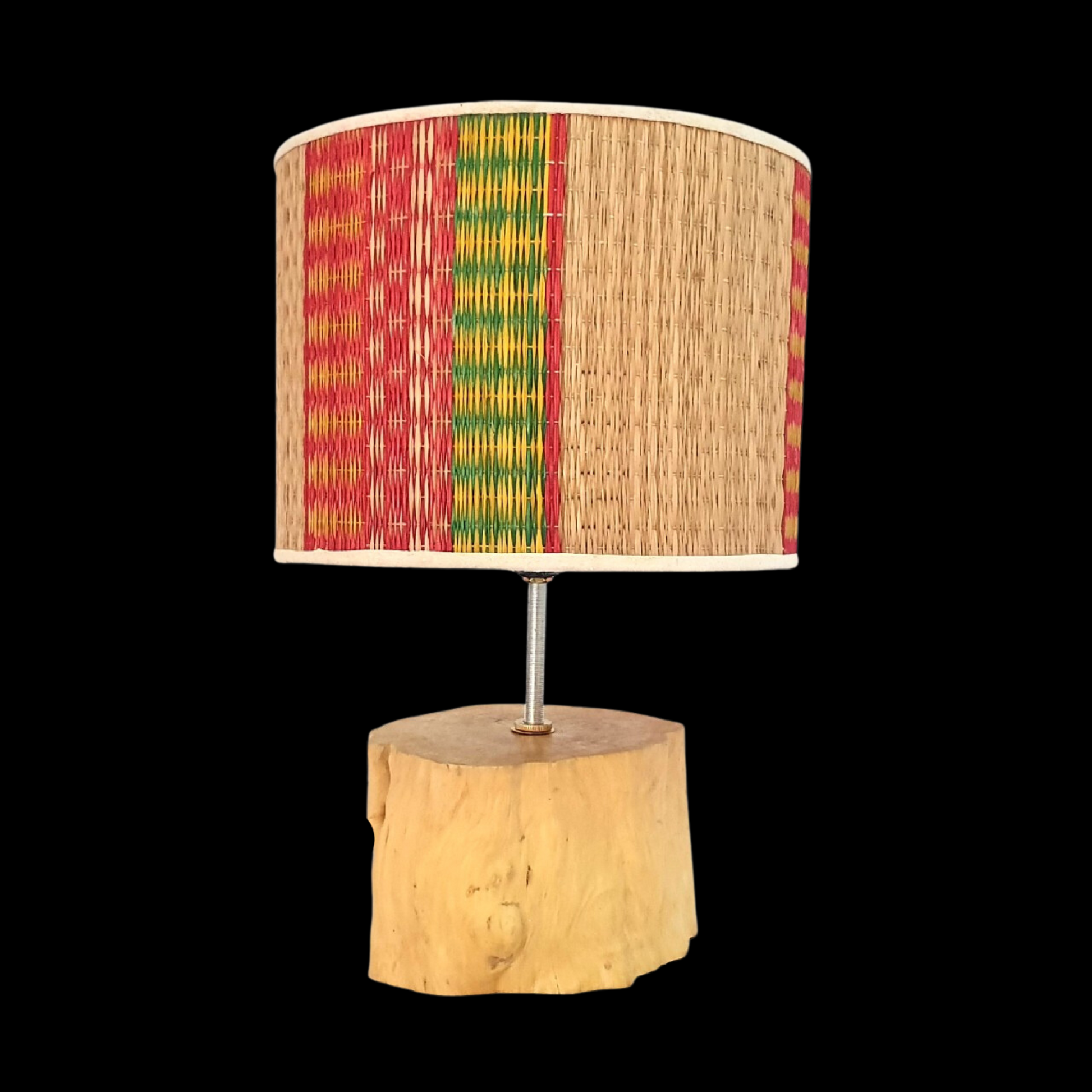 🍀 What's included: 01 wood holder equipped with 01 light bulbs.This table lamp has a body made of coffee wood. Lampshades are made of colorful sedge mats made by craftsmen, this is also a traditional feature of Vietnam. Its warm light and unique shape create a cozy and friendly atmosphere in any room, making it perfect for reading, studying or simply relaxing.