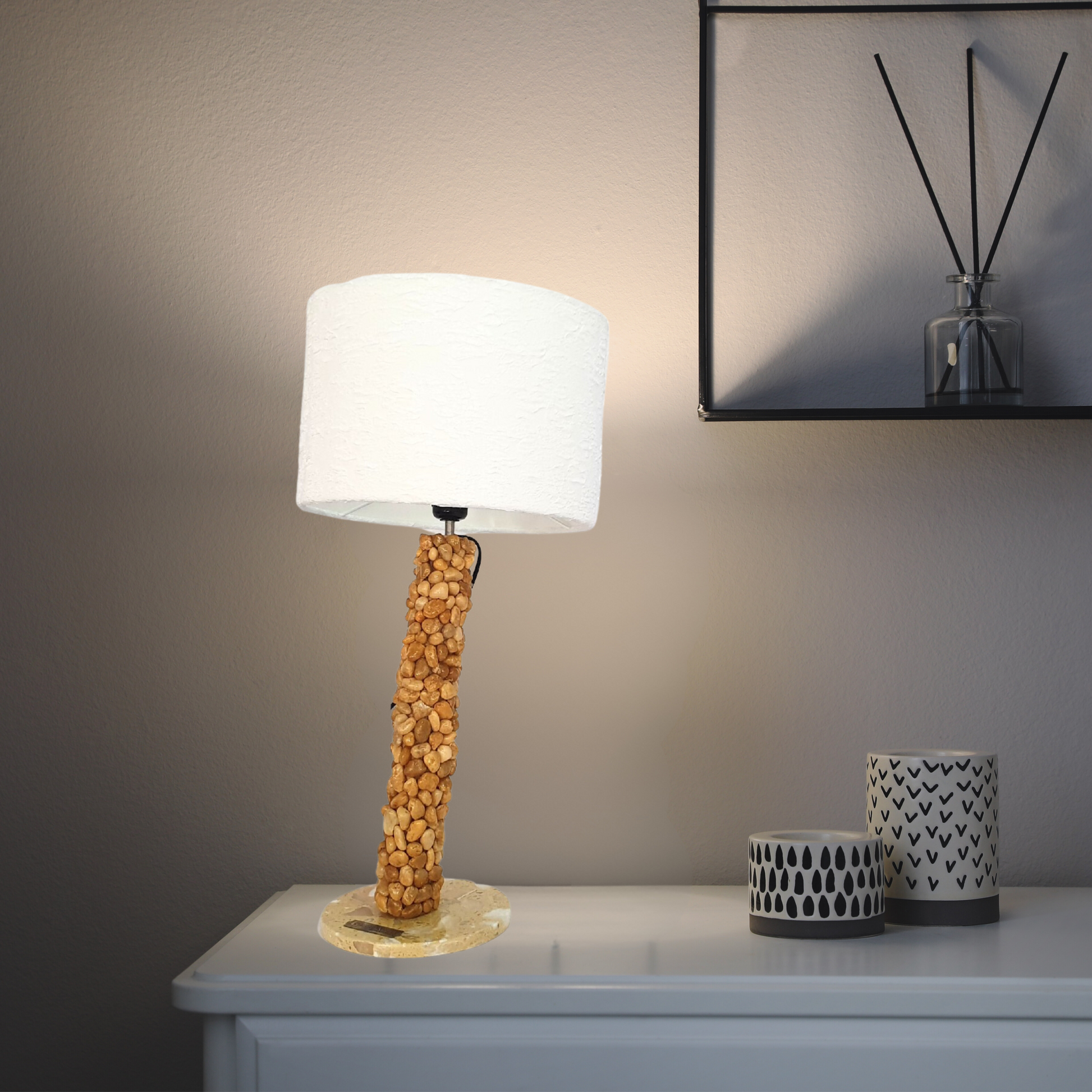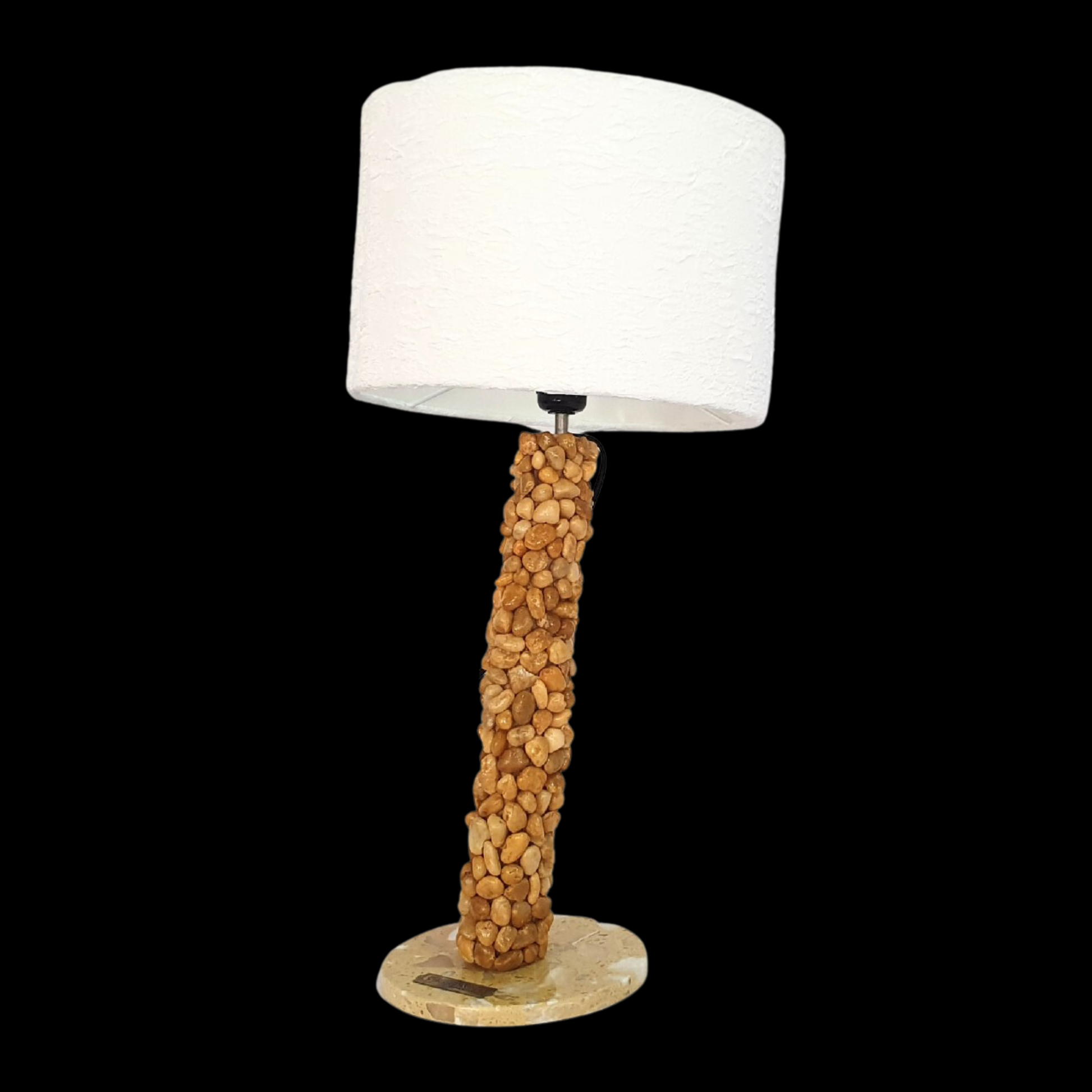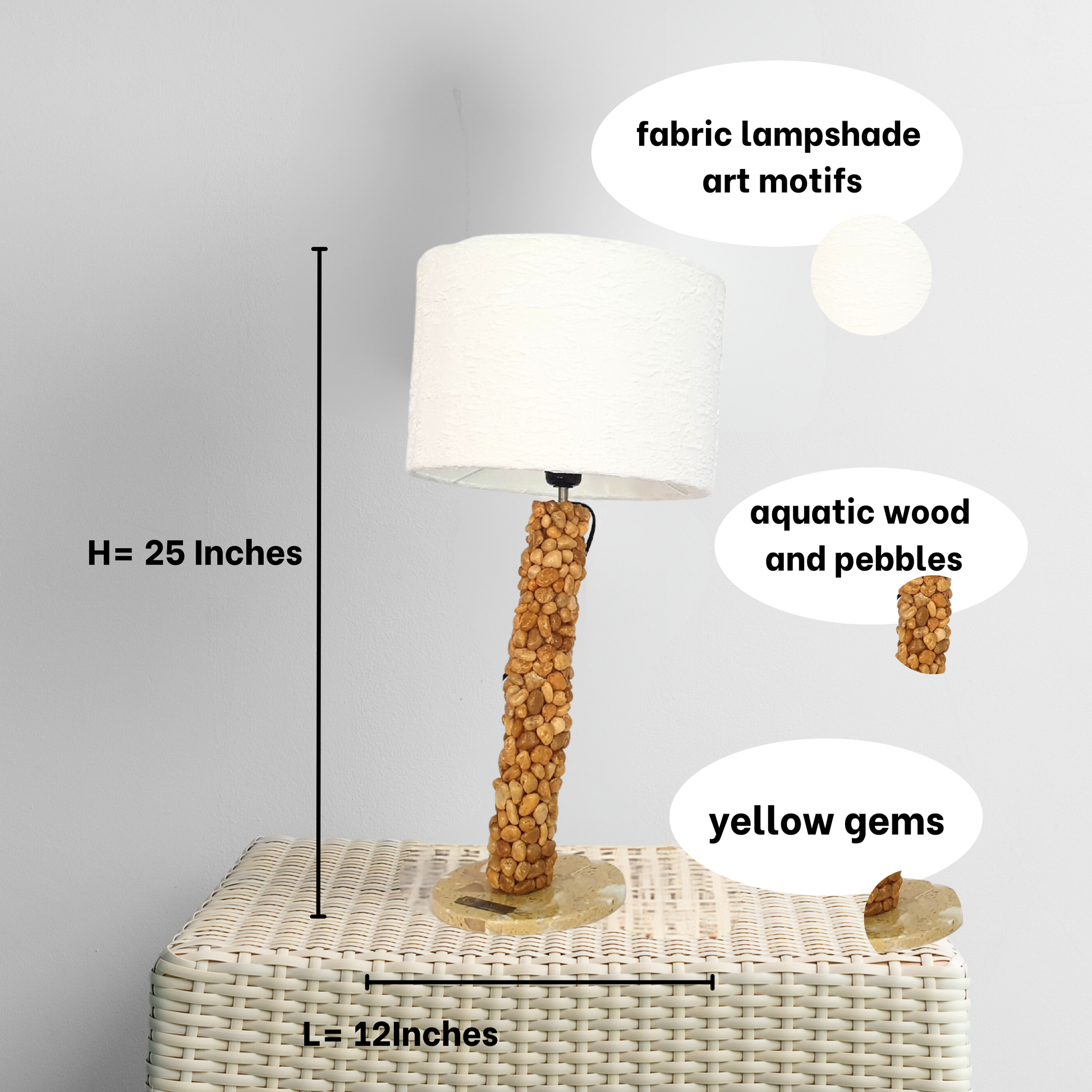 🍀 What's included: 01 wood holder equipped with 01 light bulbs.This table lamp has a aquatic wood body and is studded with pebbles. The lampshade is made from textured fabric and made by craftsmen. Its warm light and unique shape create a cozy and friendly atmosphere in any room, making it perfect for reading, studying or simply relaxing.